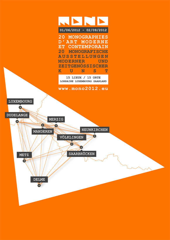 La manifestation MONO se déroule du 1er juin ou 2 septembre 2012 dans 15 institutions culturelles de Lorraine, de Sarre et du Grand-Duché de Luxembourg. 20 monographies modernes et contemporaines seront exposées au public.