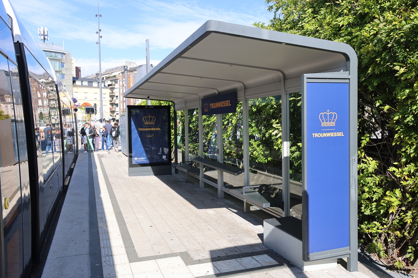 À l’occasion du grand final de la tournée célébrant l’accession au trône du Grand-Duc Guillaume et de la Grande-Duchesse Stéphanie, le réseau Luxtram lance une opération totalement inédite. La station de tram « Theater » est renommée « Trounwiessel » jusqu’au lundi 6 octobre 2025, et se voit équipée d’un habillage festif aux couleurs de l’événement.